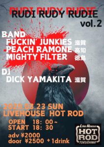 2025/03/23(Sun)ACT:ROCK BAND/ FUCKIN'JUNKIES (滋賀) PEACH RAMONE (高知) MIGHTY FILTER (徳島) DJ/ DICK YAMAKITA (滋賀)